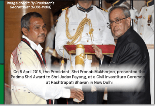 In recognition of his immense contribution, Jadav Payeng has received numerous honours, including the Padma Shri in 2015, one of India’s highest civilian awards. He has been invited to international environmental forums in countries like France, Scotland, Taiwan, and Dubai, where he shares his knowledge about afforestation and conservation. His life has also inspired the documentary film “Forest Man”, which won international acclaim.