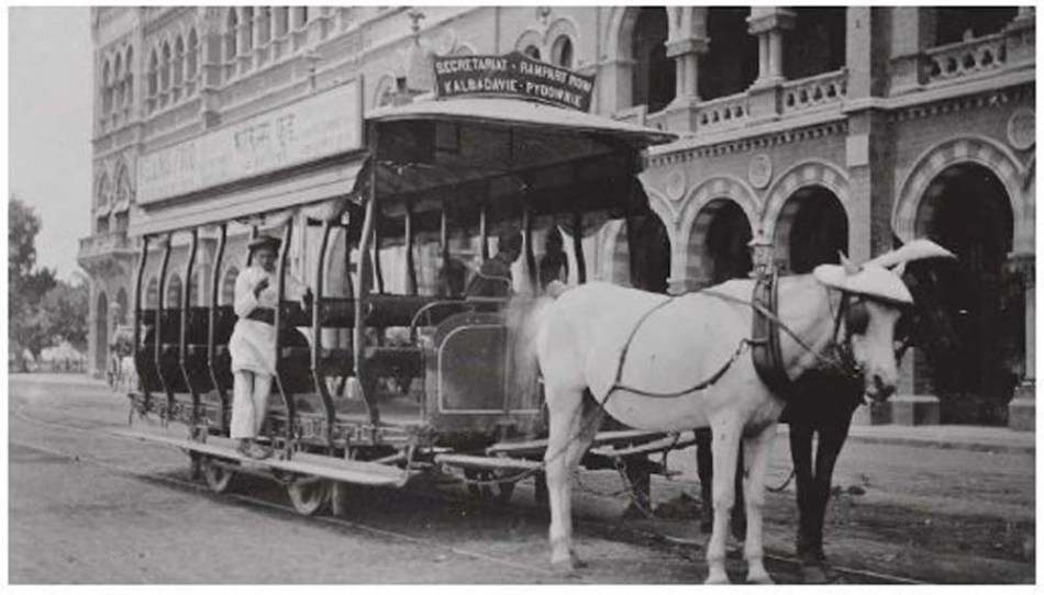 मुंबई में पहले हॉर्स ट्राम में एक ही ट्रैक था जो बोरी बंदर (अब मुंबई सीएसटी के रूप में जाना जाता है) से कोलाबा और क्रॉफर्ड मार्केट के माध्यम से पायधोन तक चलता था। ट्राम इंग्लैंड में बनाए गए थे और मुंबई भेजे गए थे, जहां उन्हें जोड़कर तैयार किया गया था।
