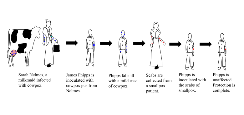18वीं शताब्दी के अंत में, ये देखा गया था कि काउपॉक्स से पीड़ित लोग जो गायों के साथ रहते थे या उनके काम करते थे, वो चेचक से बचे रहते थे। एडवर्ड जेनर ने इस घटना के बारे में सुना था और इसकी जांच करने के लिए निकल पड़े। 1796 में, उन्होंने अपने माली के आठ साल के बेटे पर चेचक का टीका लगाकर एक प्रयोग किया। लड़के में बीमारी तो हुई लेकिन वो ठीक हो गया, जिसके बाद जेनर ने उसे चेचक का टीका लगाया। जेनर को ये देखकर राहत मिली कि लड़के को बीमारी नहीं हुई और इस तरह वह चेचक से बचा रहा।