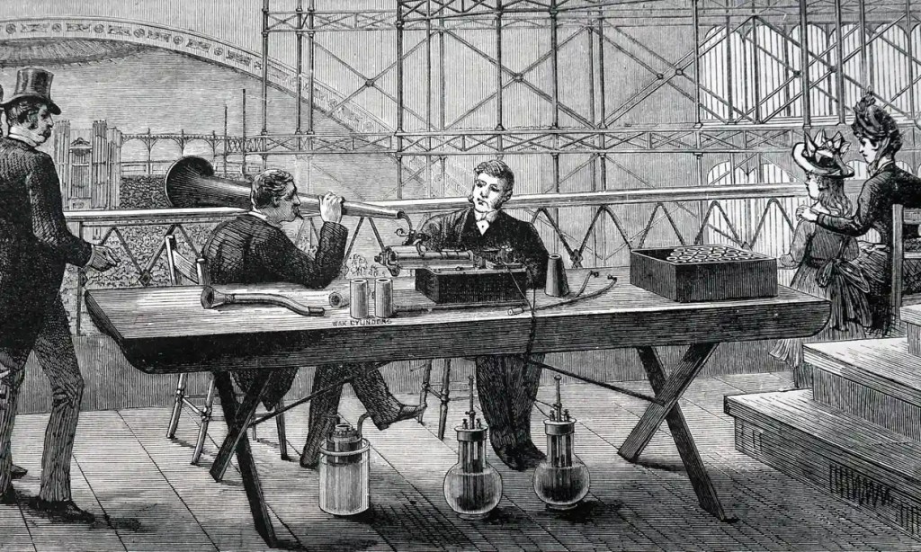 थॉमस एडिसन के फोनोग्राफ का सार्वजनिक प्रदर्शन, क्रिस्टल पैलेस, लंदन, 1888।