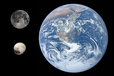 Pluto (bottom left) compared in size to the Earth and the Moon