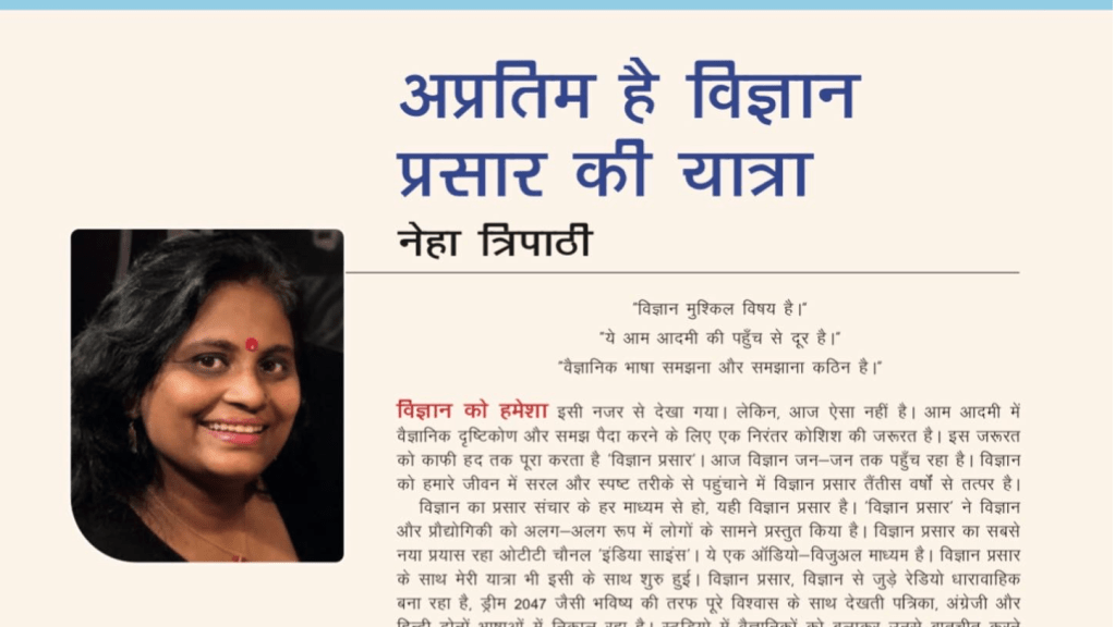 by Neha Tripathi 22 Nov 2022 Published Articles अप्रतिम है विज्ञान प्रसार की यात्रा Note : This story was published in prestigious magazine of Vigyan Prasar ‘DREAM 2047’ (Hindi). “विज्ञान मुश्किल विषय है।” “ये आम आदमी की पहुँचContinue Reading